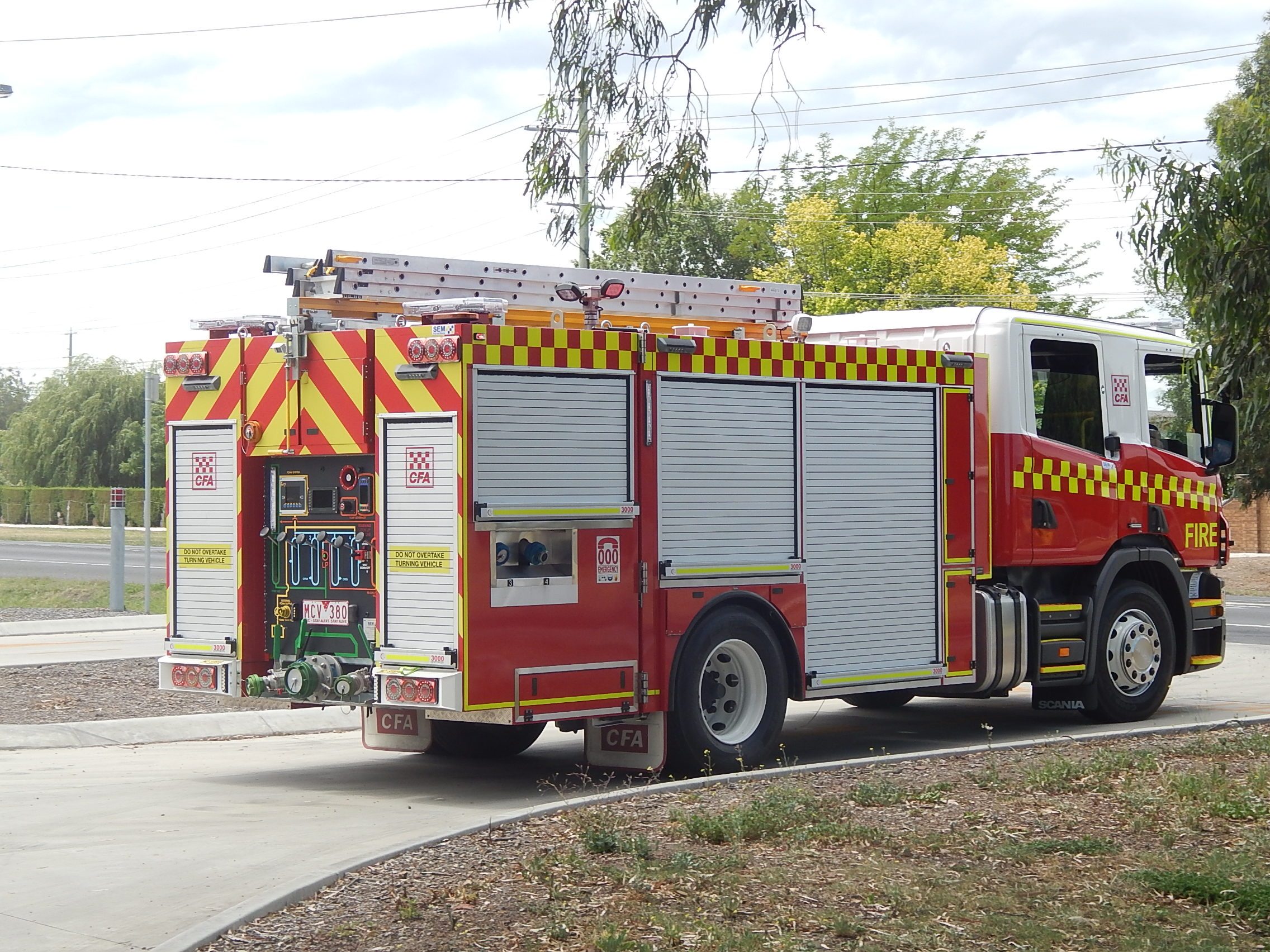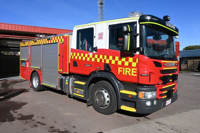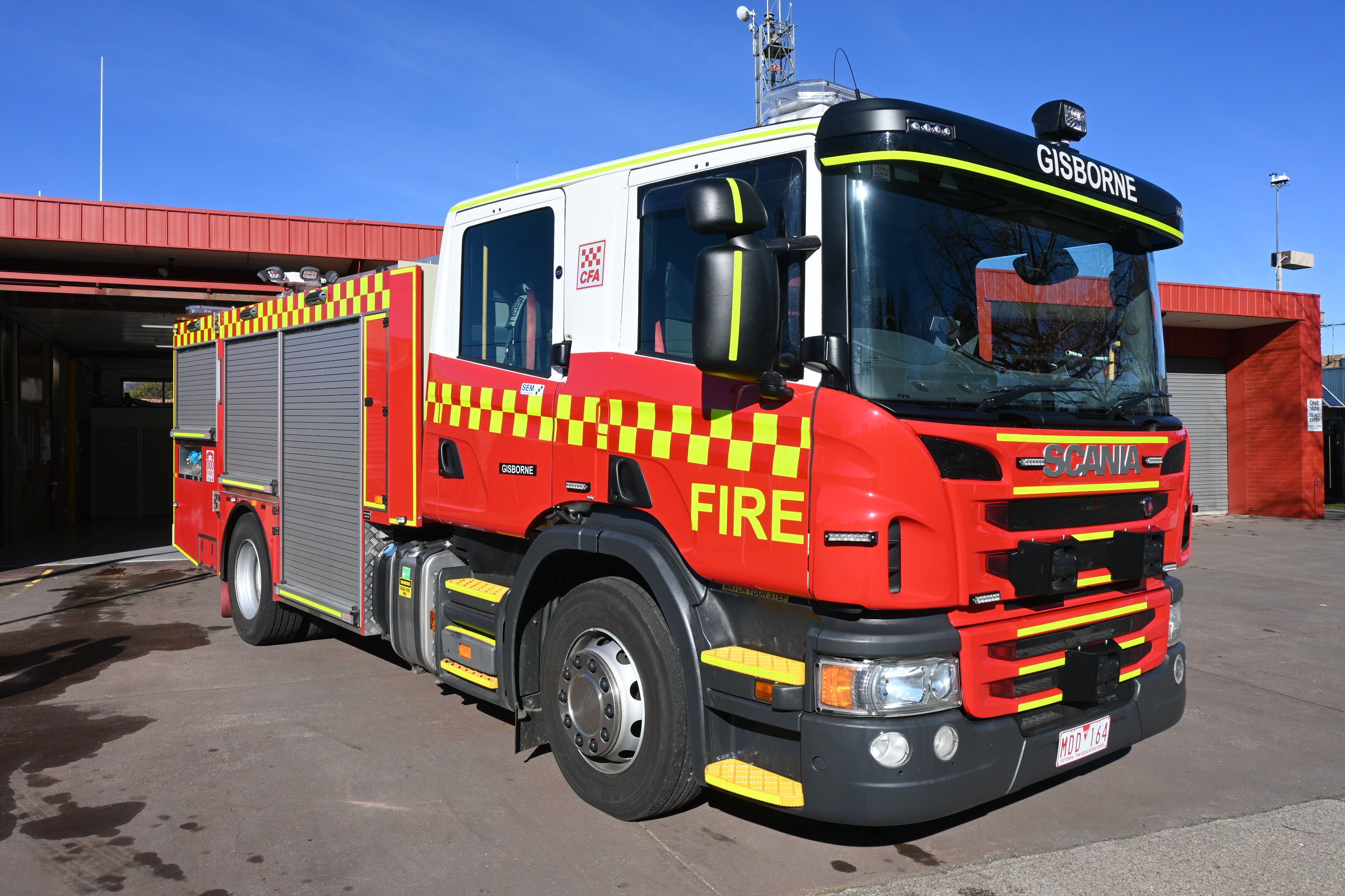 CFA GISBORNE MEDIUM PUMPER. SCANIA P310 CREW CAB. PUMP MAKE/MODEL: GODIVA P1B 4000. WATER TANK CAPACITY: 2500 LITRES.